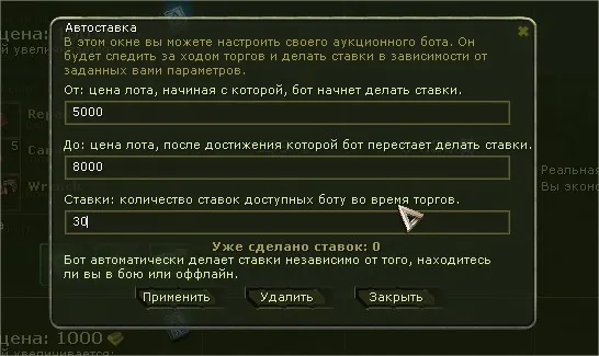 Если игрок решил поторговаться за тот или иной аукционный бот, но не хочет или не может находиться в игре или, наоборот, хочет в это время повоевать на арене, шахте или принять участие в штурме, то этот помощник как раз для него. Достаточно просто установить параметры ведения торгов, включить бота и продолжать заниматься своими делами.