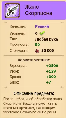 Дроп с этой няшности скрыт, снова же проводим незримую линию с Низзером. Дропатся с него будут те же эликсиры – агония, проклятие, озверин, хилка, банка маны и синие/фиолетовые шмотки по типу кольца хранителя и т.д. А среди всего этого ненужного дропа иногда будет попадаться Жало Скорпиона