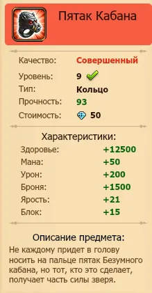 Его тоже нельзя купить, работы в пещерах всегда были на пользу физической подготовке Хранителей =) Получите вы его после того, как вытащите из кабана одно колечко. Кабан по силе, заклам и скорее всего по дропу - похож на Курлыка, а вот награда за образ, как по мне, дешевая очень. Лучше бы туда какую нибудь стату засунули, к примеру за образ дадут 10 блока или что-то около того. Но имеем то, что имеем – 2500 жизни и 100 лечения за первое найденное колечко с кабана, и они ваши.