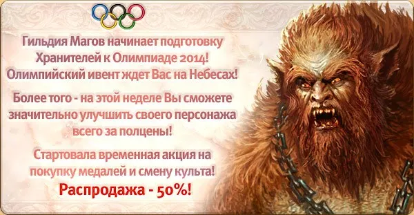 А также Гильдия магов продолжает подготовку к олимпийским играм и вновь введен олимпийский инвент, собрав который, вы получите медаль " Властелин колец" и сможете получить в награду образ "Джегурдарр". Но и это еще не все, также для прокачки Вашего персонажа была введена недельная акция, в которой скидка на покупку новых медалей и смену культа составила целых 50%. Я считаю это превосходной возможностью заработать образ тем, кто не успел этого сделать, так как в скором будущем образы можно будет заработать только в яростных боях.Ведь покупку образов отменят,и их можно будет купить только во время проведения специальной акции. Такое введение уменьшит разрыв между игроками, которые способны купить образы, и игроками, которые не способны. Не упустите свой шанс, соберите все кольца и медали получите заветный образ, удачи вам и побольше удачных боев!!!