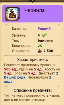 Чернила – аналог проклятия, если быть совсем точным то проклятия 3го уровня (зеленое). При использовании снимает у соперника 500 брони, удачу, блок и ярость на 5. В каждом банке по 25 стаков этой прелести. Выпадает из червей в пещерах любого уровня, а также на арене.