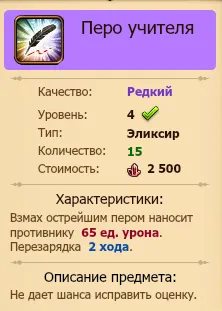 Перо Учителя - самое интересное из того что есть в ивенте! Аналог новогоднего снежка, если кто помнит какого они шороху наводили на арене то вы поймете о чём я ) Наносит 65 урона + урон персонажа, т.е. у вас в запасе появляется дополнительный нюк (Нюком в онлайн-играх, допустим в Линейке, называют атакующее заклинание чара-мага, наносящее урон одной порцией.), что очень часто решает исход сражения. Выпадают со всех островных мобов, кроме Армии Хаоса, червей и с арены. Настоятельно рекомендую найти их побольше и сделать запас – через пару-тройку месяцев они станут большой редкостью, а значит и приобретут цену как торговая единица.