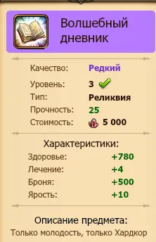 Волшебный дневник – реликвия которая является условием для получения медалей 4-го и 5-го рангов. Выпадает с барабанов и арены, причем из барабанов буквально через шмотку)