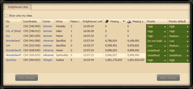 Новое окно отчетов позволит вам увидеть все освященные города вашего альянса. Это окно также предоставит вам массу другой полезной информации по этим городам: