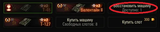 Если у вас есть такие машины, то для вас будет доступен и второй способ их восстановления — через Ангар. В карусели техники рядом с окнами покупки новых машин и слотов появится окно «Восстановление», которое будет показывать, сколько танков можно восстановить.