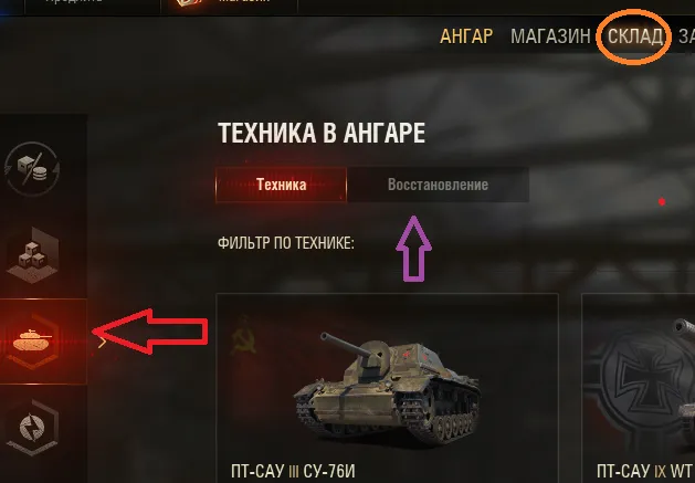 Чтобы восстановить проданные премиум машины, нужно войти в меню «Склад»