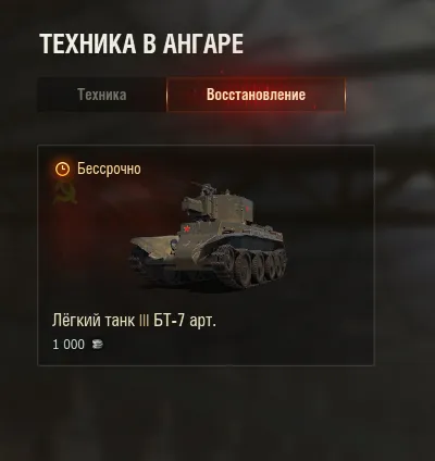 Выбрать вкладку «Техника в Ангаре». Появится вкладка «Восстановление», на которой вы увидите список танков, которые можно восстановить, и всю сопутствующую информацию.
