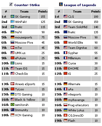 Установлены лидеры и топ 12 команд, которые будут участвовать в Мировых Финалах в марте, так как по дисциплинам CS 1.6 и LoL не предвидеться соревнований, имеющих возможность поменять данные позиции за это время.