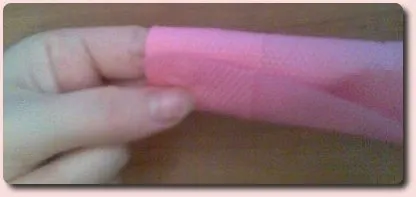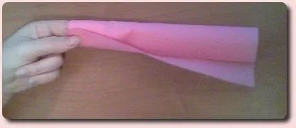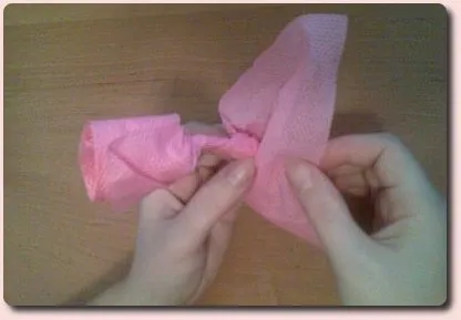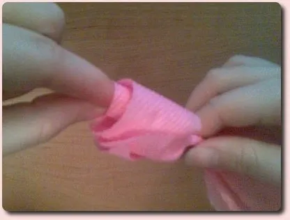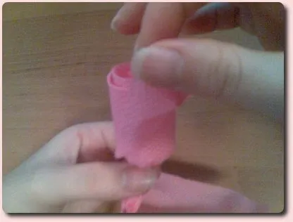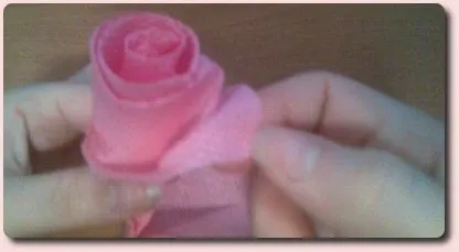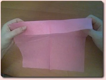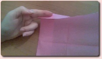 Зажмите левый верхний угол салфетки между указательным и средним пальцами (чтобы получить более аккуратную и миниатюрную розочку можно использовать средний и безымянный пальцы или безымянный и мизинец).