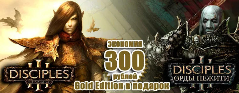 Те же, кто еще не успел приобрести лицензионные игры серии, могут прямо сейчас скачать "Коллекцию Disciples III: Ренессанс + Орды нежити" по заманчивой цене на сайте портала цифровой дистрибуции Gama-Gama. Все игроки, воспользовавшиеся этой акцией, получат gold-издание автоматически.