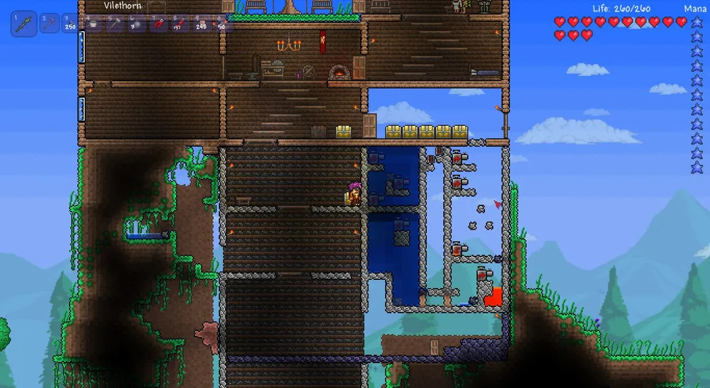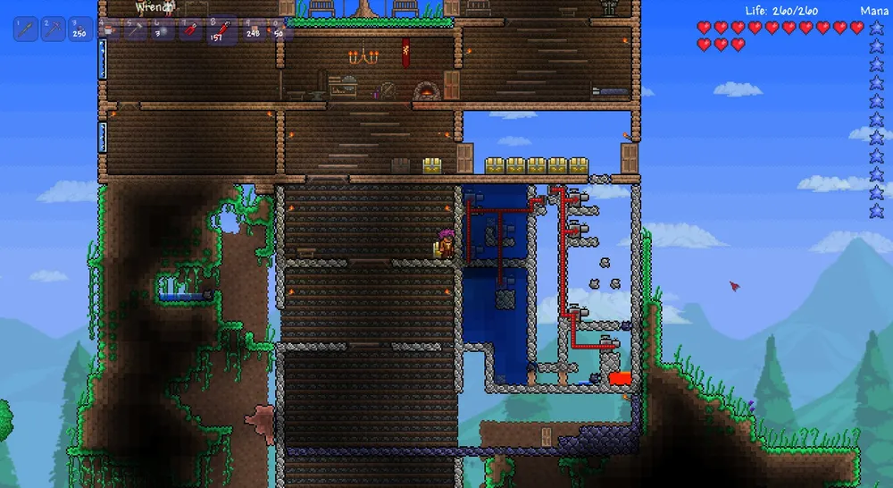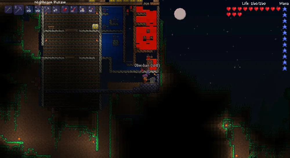 Задумал я построить свой замок из обсидиана. Первым делом заглянул во всякие гайды и был ошеломлен – люди покупают многие тысячи проводов, чтоб построить завод, который совершенно не окупится. И я, только что победивший скелетрона, не смогу и за много-много дней совершить такой подвиг. Однако, я узнал одно замечательно свойство проводов в Terraria – из них выходит больше, чем вошло. Прекрасно! Это свойство мы и используем.