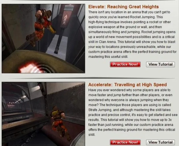 Теперь желающим предлагается попрактиковаться в распрыжке и рокетджампах. Все обучение разбито на 3 этапа. Для каждого этапа есть возможность посмотреть правильное исполнение трюков в исполнении неизвестного задрота игрока. Для каждого трюка есть название, описание и способ исполнения. Как обучение это весьма хорошая вещь, вдвойне приятно, что это сделано разработчиками, а не усилиями энтузиастов.