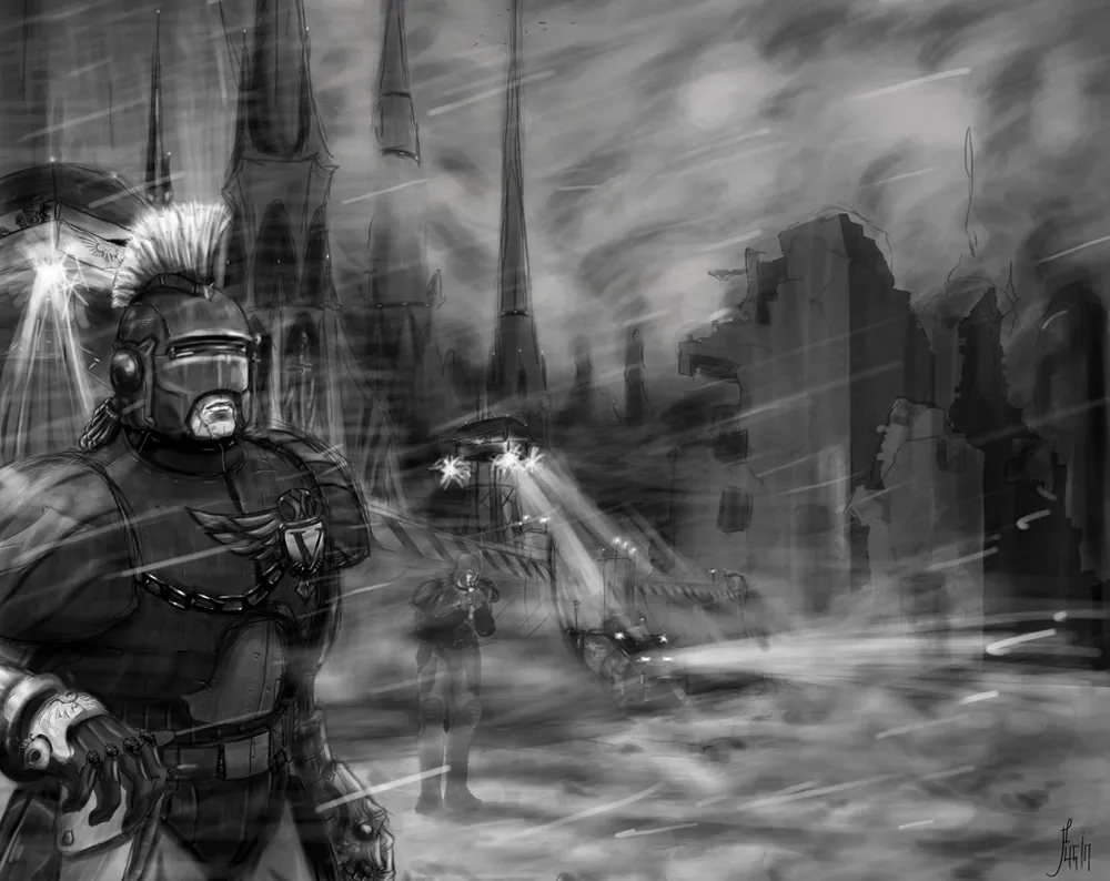 При их приближении над Воняльней сгущалась тьма. Вооруженные солдаты в черных доспехах шли по извивающимся залам с дробовиками наизготовку у плоских нагрудников. За ними в потоках воздуха от перерабатывающих кислород установок развевались темные плащи. Патрульный отряд Арбитров, шестеро мрачных человек в полных доспехах, вызывал страх у обитателей вонючих бараков и покосившихся хижин Нижнего Улья.