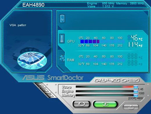 Вначале попробуем в деле утилиту ASUS SmartDoctor. Возможности SmartDoctor по установке тактовых частот ядра и памяти полностью совпадают с возможностями утилиты AMD OverDrive - предельные частоты для ядра и памяти составляют 1000/4800 МГц соответственно. Однако при помощи ASUS SmartDoctor можно поднимать напряжение на графическом ядре видеокарты; максимально возможное напряжение - 1,45 В. Для непрофессионального использования возможностей этой утилиты вполне достаточно. С ее помощью мы добились стабильной работы видеокарты на частотах 1000/4000 МГц.