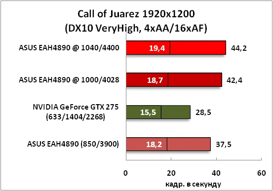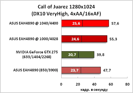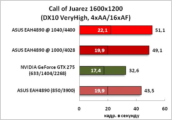 Ну а в Call of Juarez все наоборот. Видеокарта ASUS EAH4890 чувствует себя вольно и, горделиво "поигрывая" транзисторами, демонстрирует свое преимущество над конкурентом.