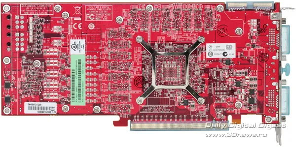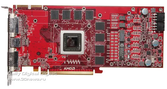 Сама плата выполнена на основе эталонного дизайна AMD и не отличается от прочих аналогов ничем, кроме оформления системы охлаждения.
