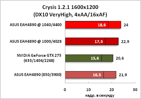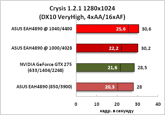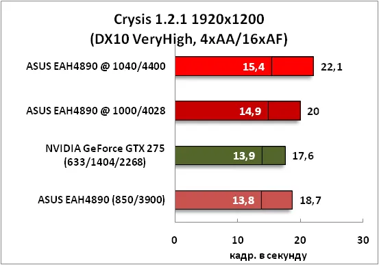 В самых тяжелых режимах Crysis более благосклонен к видеокарте ASUS EAH4890, которая немного отстала от NVIDIA GeForce GTX 275 лишь в низком разрешении. Радует тот факт, что минимальный fps в разрешении 1280x1024 на максимально разогнанной EAH4890 не опустился ниже 25 кадров в секунду. Однако долго играть на таких частотах не выйдет.