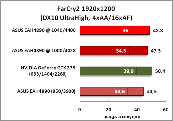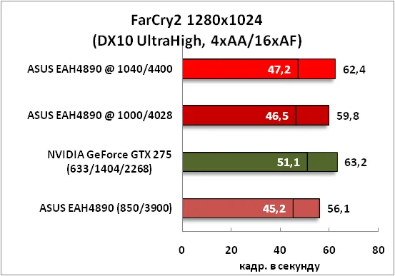 В FarCry 2 видеокарта ASUS EAH4890 показывает хорошие результаты, даже в самом высоком разрешении частота смены кадров не опускается ниже 30 fps. Правда, противостоять NVIDIA GeForce GTX 275 довольно сложно, даже разгон не может повлиять на расстановку сил.