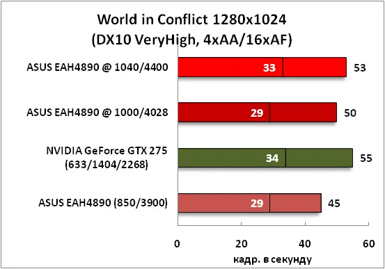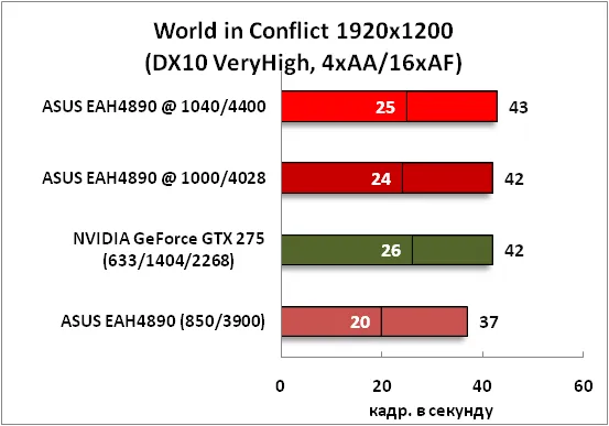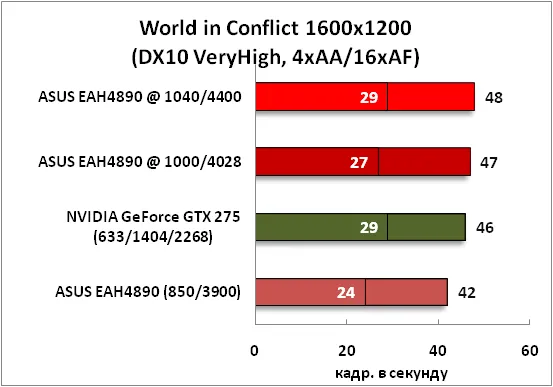 World in Conflict позволяет говорить о заметном преимуществе NVIDIA GeForce GTX 275 перед видеокартой ASUS EAH4890 в самых тяжелых режимах, где разница составляет 5-6 fps. Разгон позволяет выровнять ситуацию, и в разрешении 1920x1200 разогнанная плата ASUS идет практически на равных с GTX 275.