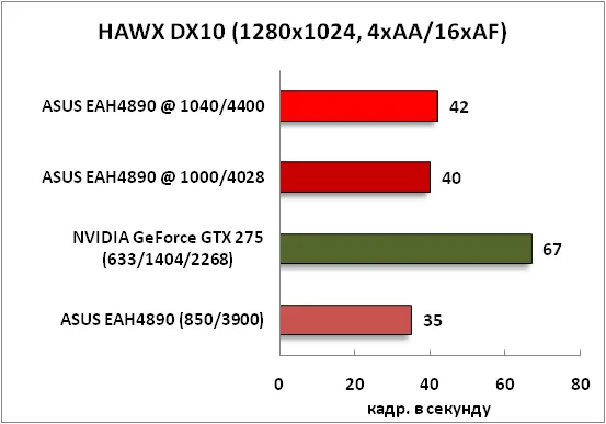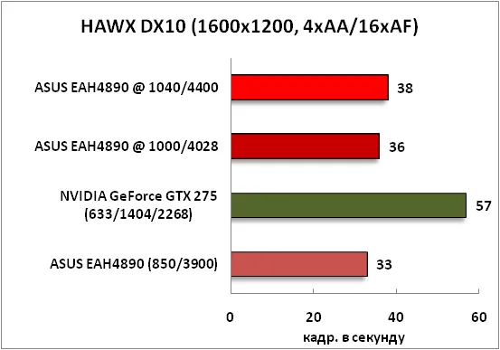 Вначале ускоритель NVIDIA GeForce GTX 275 шел на равных с неразогнанной ASUS EAH4890, однако с ростом разрешения представитель NVIDIA резко сдал позиции и существенно отстал от решения ASUS.