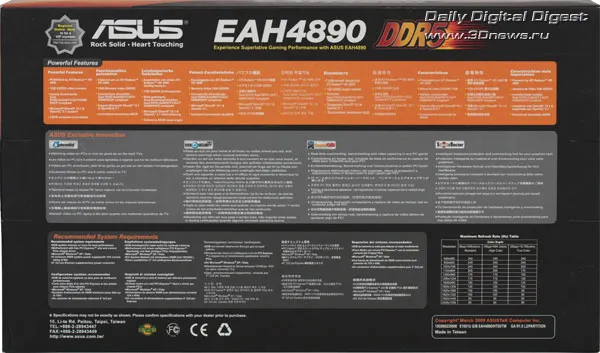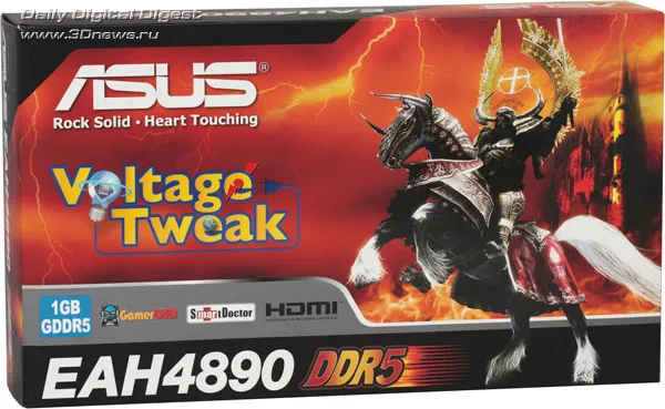 Решительный боевой настрой персонажа, изображенного на упаковке ASUS EAH4890, всячески подчеркивается общим оформлением. Лицевая сторона содержит информацию об основных особенностях видеокарты, а именно - типе и объеме установленной памяти, поддержке HDMI, Voltage Tweak, а также ряде других фирменных технологий ASUS.