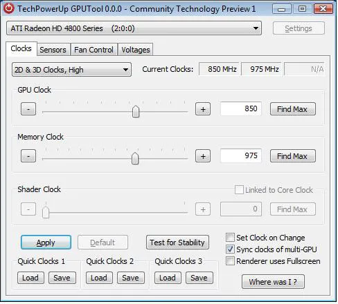 На основной панели расположено всего три ползунка - напряжение на ядре GPU, частота ядра и частота видеопамяти. Чуть выше находится температурная шкала, которая показывает температуру ядра GPU как в градусах Цельсия, так и по Фаренгейту. Все, что требуется от пользователя, так это выставить нужные значения и нажать кнопку "применить". После этого можно переходить к проверке на стабильность, нагружая ускоритель сложными вычислениями, например, игрой в HAWX с полноэкранным сглаживанием и анизотропной фильтрацией.