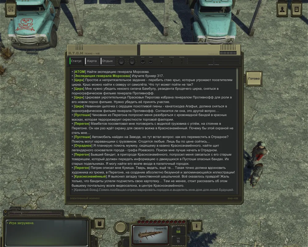 Шучу, конечно. Надеюсь вы не против шуток? Потому что в ATOM RPG их выше крыши. А ещё там полно отсылок к советской и российской культуре. Чуть ли не каждый встречный готов рассказать забавную историю или страшную байку, а может и философскую притчу. Но юмор, как я уже говорил, преобладает.