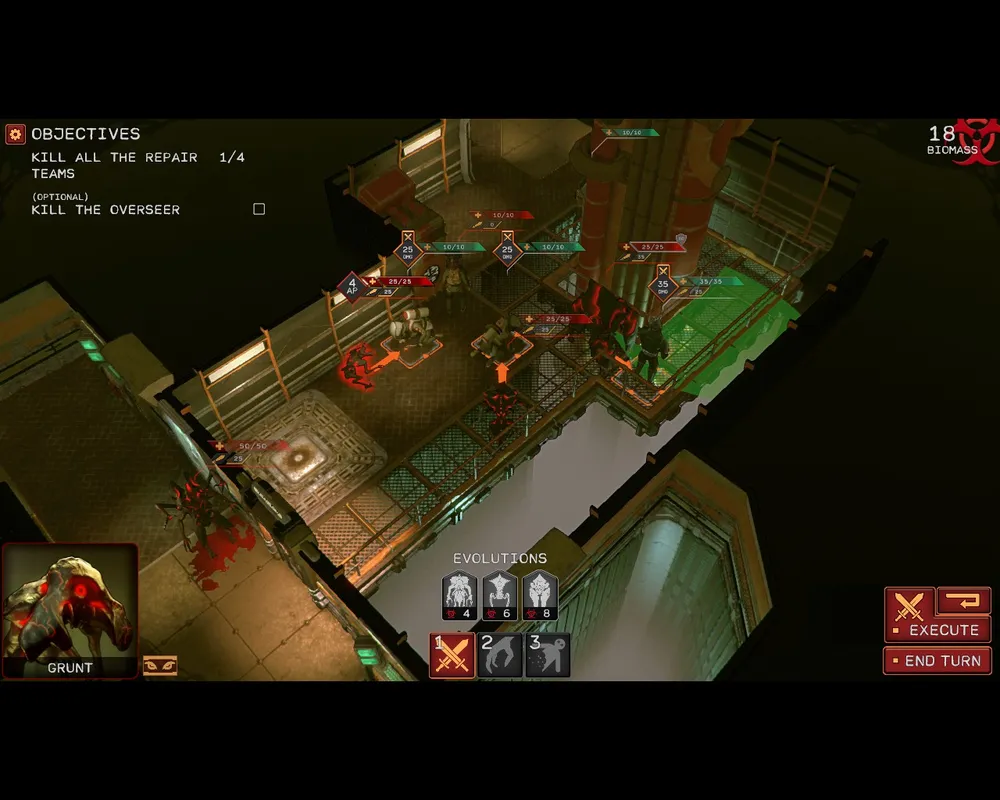 Всего у «технологического древа» четыре ветви — для Гигантов, Разрушителей, Сталкеров и Матриарха. Да, матка тоже может драться, однако ей нельзя погибать — тогда конец игры. Плюс, есть отдельный апгрейд, позволяющий превратить одного человека в послушного дрона. Правда, он нужен лишь на одном уровне.