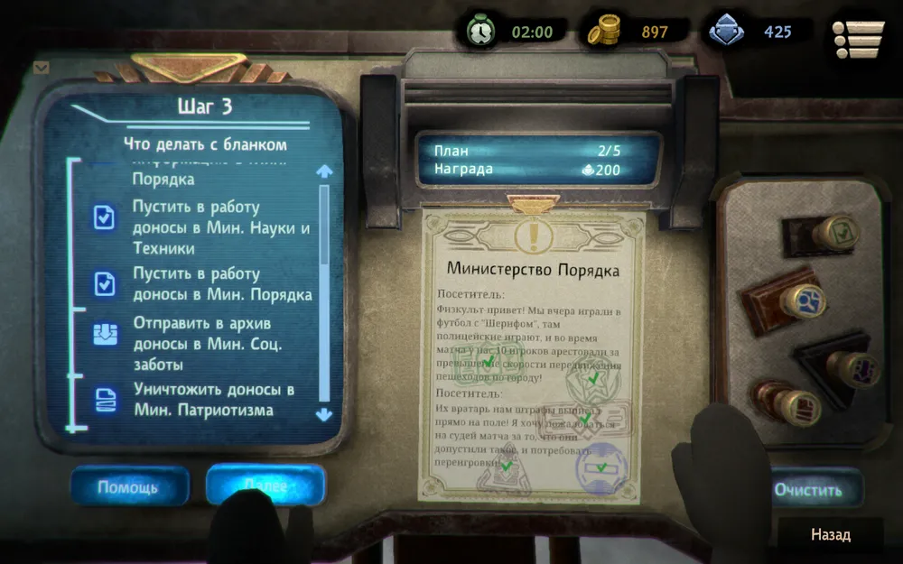Работа клерка с которой мы начнём на первом этаже – направить посетителей со своими проблемами в требуемое ведомство, ошибка ничего не стоит кроме потери времени, а оно у нас один из ценных ресурсов, а потому стоит внимательно вникать в суть проблемы, дабы принять верные решения. Успешное выполнение задание – получение оплаты и рост очков авторитета. Для успешного выполнения нужно определить, что за проблема у человека, затем определить в сферы деятельности какого ведомства относится проблема и, наконец, выяснить принимают ли в день обращения представители данного Министерства. Сложности могут возникнуть только на первых порах, стоит просто внимательно прочитать справку, которая вводит разграничение всех претензий по сферам влияния каждого из Министерств, а с датой посещения – просто быть внимательным.