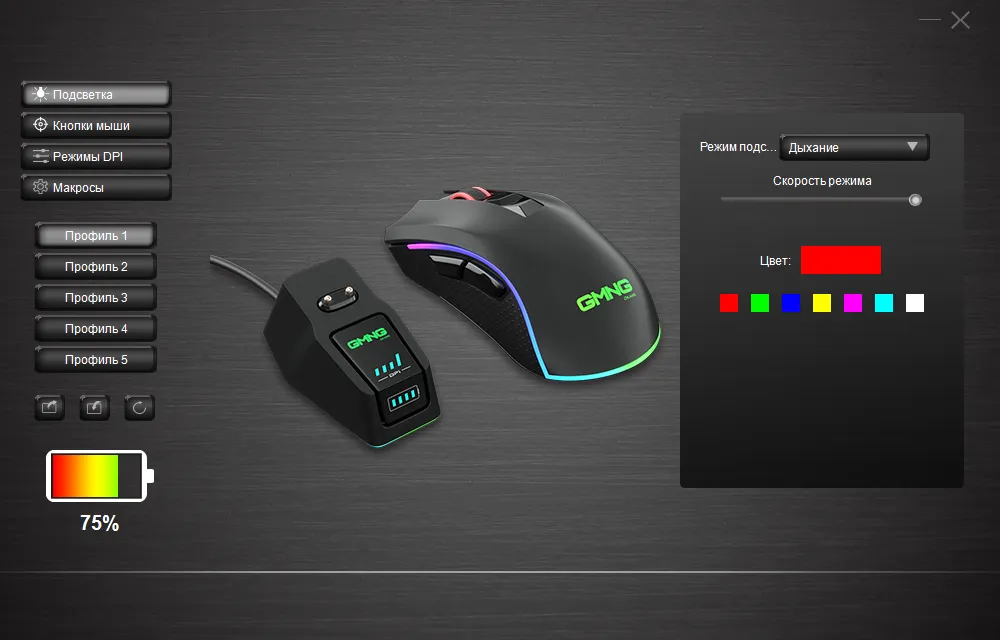 Подсветка имеет несколько режимов, причём в «статичном» можно выбрать цвет. А в динамических (их несколько — волна, дыхание и т. п.) скорость. Правда подсвечиваются всегда одни и те же элементы — колёсико (во время зарядки) и контур мыши. А также основание док-станции и надпись GMNG на ней же.