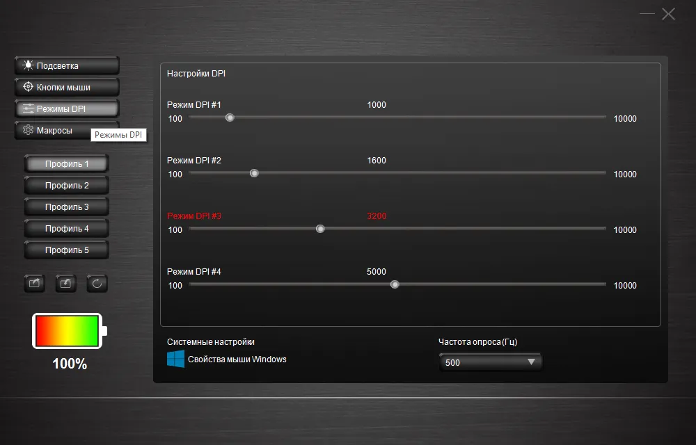 Именно через него можно выбрать dpi для всех четырёх режимов чувствительности.