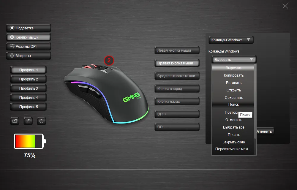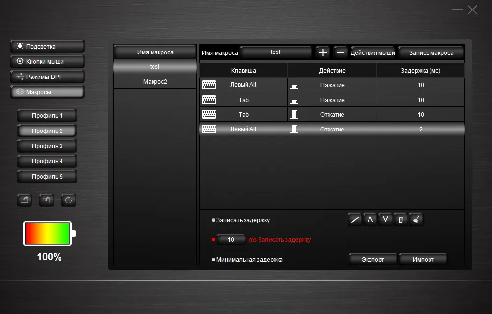 Да, для всех настроек кнопок и подсветки имеется пять «Профилей». Саму смену профиля, кстати, тоже можно повесить на одну из кнопок. Плюс профили можно сохранять в файл, если вам нужны какие-то особые варианты настроек, которыми вы пользуетесь достаточно редко.