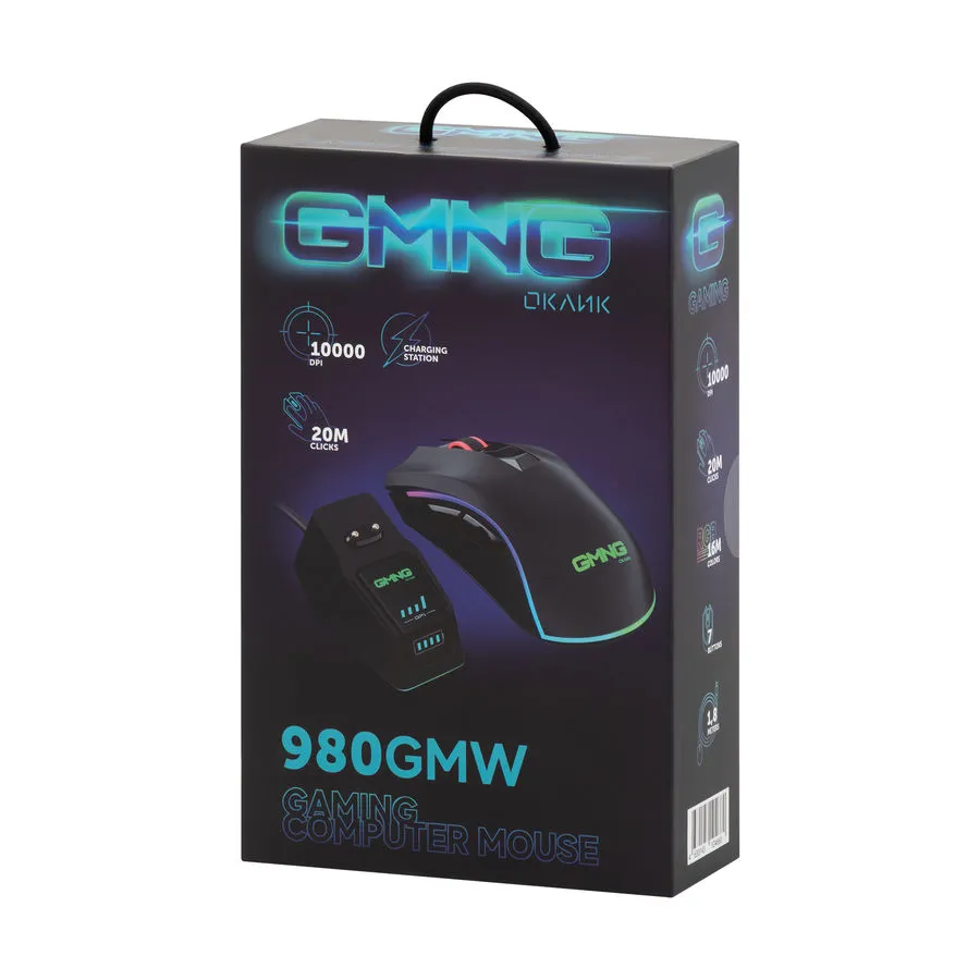 Мышь GMNG 980GMW обладает не только 7-ю кнопками, 4-мя уровнями чувствительности и динамической подсветкой. Она имеет режим работы без проводов, соединяясь с компьютером по Bluetooth-каналу через входящую в комплект док-станцию.