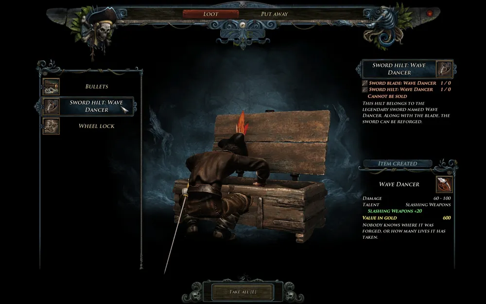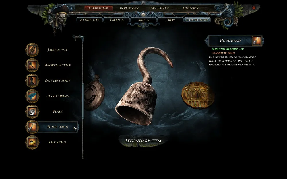 И к слову о протезах: нет, их нельзя будет нацепить (даже если вам очень хочется стать капитаном Крюком, скормив руку аллигатору). Исследуя мир, вы будете находить уникальные предметы, повышающие характеристики и навыки. И этим предметом может быть что угодно – разброс от засушенной головы до уже упоминавшейся деревянной ноги. Историю и предполагаемое местоположение предмета можно почерпнуть из разбросанных по миру книг. Чаще всего эти артефакты валяются около сундуков с сокровищами, продаются торговцами и даются за выполнение заданий.
