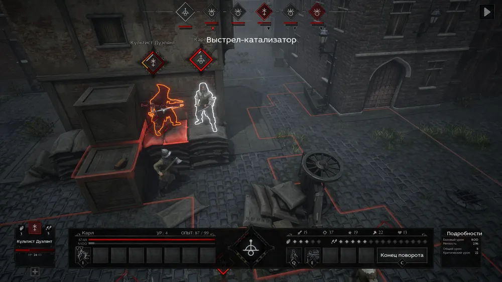 Итак, игроку предлагается взять на себя управление отрядом из четверых наёмников и пробиться сквозь туман, обволакивающий город. Казалось бы, сейчас начнётся выживание, борьба не только с культистами, но и с туманом. Но нет, он как бы есть, но никакого влияния на происходящее не оказывает.