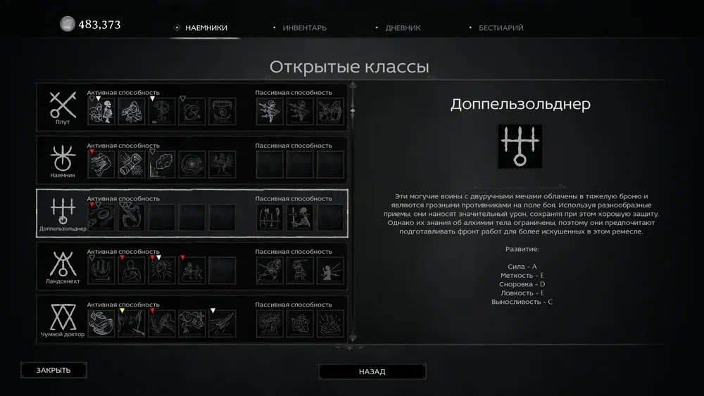 Каждый класс развивается по заранее заложенной программе. Т.е. никаких очков навыков в игре не предусмотрено. Если играешь стрелком, преимущество автоматически отдаётся меткости. Палачом или дуэлянтом – силе. Но и остальные навыки тоже растут, но не так сильно, как основной(ые). Чтобы ещё сильнее запутать игроков, разработчики мало того, что не сделали подсказки к пиктограммам, обозначающим навыки, так ещё и в окне выбора класса степень развития характеристик обозначили просто латиницей: A,B,C,D,E,S,S+.