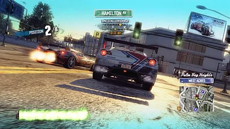 Почти каждый перекресток в Парадиз-сити является отправным пунктом к соревнованиям. К «гонкам» можно отнести только один тип – Races. Да и то с натяжкой. Во многом, опять же, из-за возможности самому определять путь к финишу, а также из-за стандартных особенностей сериала – оппоненты являются не столько соперниками, сколько врагами, которые делают все возможное, чтобы выбить игрока с трассы и вырваться вперед, оставляя того любоваться аварией с участием собственной машины. Поэтому мчимся на бешеной скорости по улицам города, лавируем между препятствиями, ловко срезаем путь на многочисленных улочках, тараним других гонщиков, обновляем в придорожных заправочных запасы бустера – вперед, к победе. А ведь соперники, жулики этакие, не успокаиваются. Если отстаешь – замедлятся, поморгают задними фарами. Если обгоняешь – ускорятся, не позволят оторваться. Таким образом, всегда находишься в сердце гонки, на острие драйва.