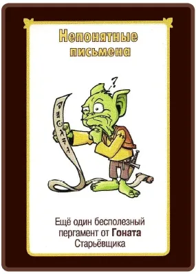 Уже Давно Ригор Мортис понял что гоблины обладают не только поразительной не компетентностью в сфере выполнения заданий, но и ещё весьма дырявой памятью. По этому он повелел, что бы на очередное задание они брали с собой небольшие карточки, из тонкого, но достаточно прочного материала, размерами с обычные игральные карты. Во время выполнения поручений Властелина они старались записывать все важные события, которые с ними происходили, что бы потом рассказать Хозяину. Точнее они их зарисовывали, так как писать не обучены. И, как довольно часто себе признавался Ригор, в графическом стиле рисунков гоблинов было что-то, что ему нравилось. Возможно это так же была одна из причин, почему Ригор до сих пор не избавился от таких нерадивых помощников. Кстати, почему-то гоблины всегда держат в руках максимум по три карточки с рисунками, а остальные сложены в общую сумку, из которой они достают новые "воспоминания". "Видимо это так же объясняется особенностями строения интеллекта гоблинов", - размышлял Владыка, а Красный меж тем продолжил свой рассказ, все больше вгоняя Ригора в скуку своим монотонным голосом: