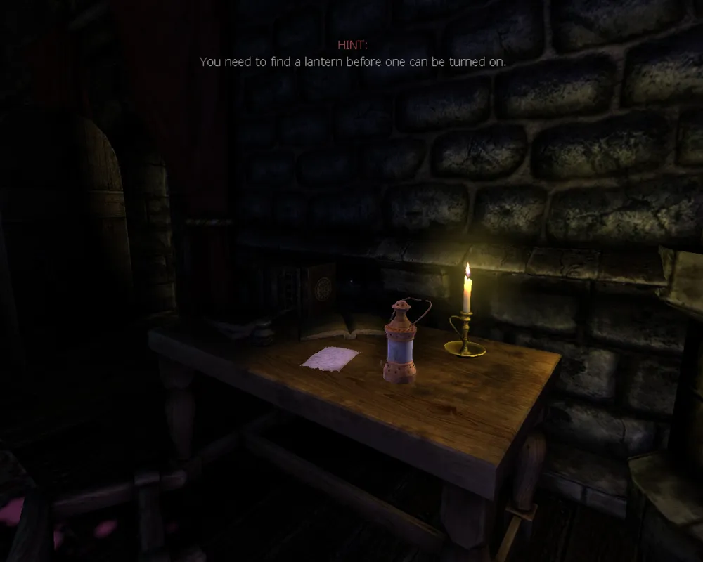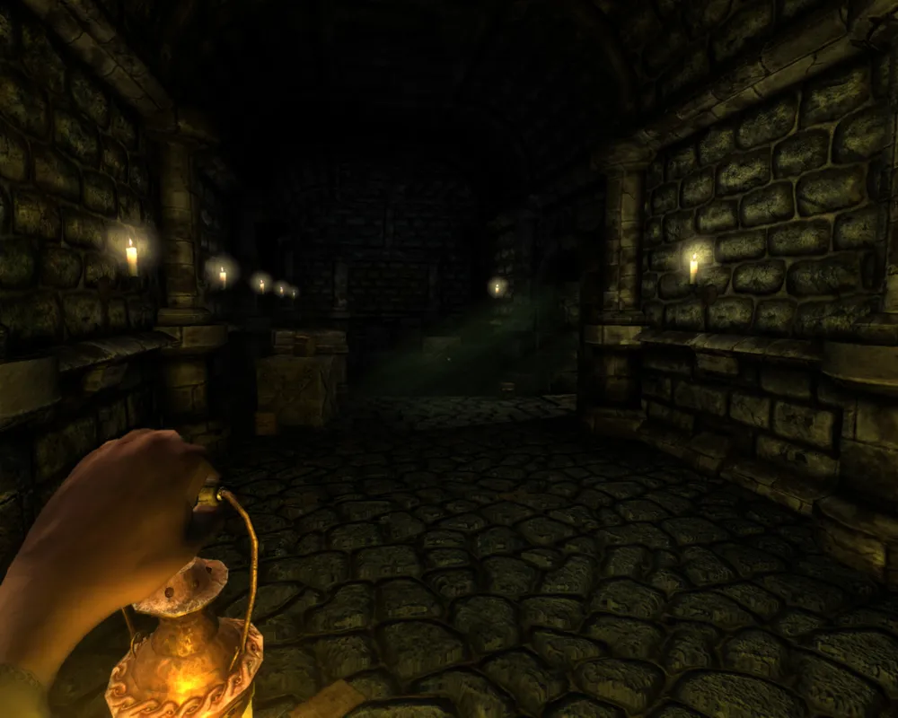 Самый главный враг Даниэля это темнота. Да да...В пенумбретемнота была нам товарищем и другом, но в амнезии это страшный враг. Находясь в темноте у нашего героя возникаю галлюцинации - перед глазами всё плывет и деформируется. Так и с ума сойти не долго. Основное оружие против темноты это свечи, факелы и самое главное масляная лампа. На всё время игры эта ваш друг. Так же по замку разбросаны Тайндер боксы - подобие на спички которыми мы можем поджигать свечи и факелы.