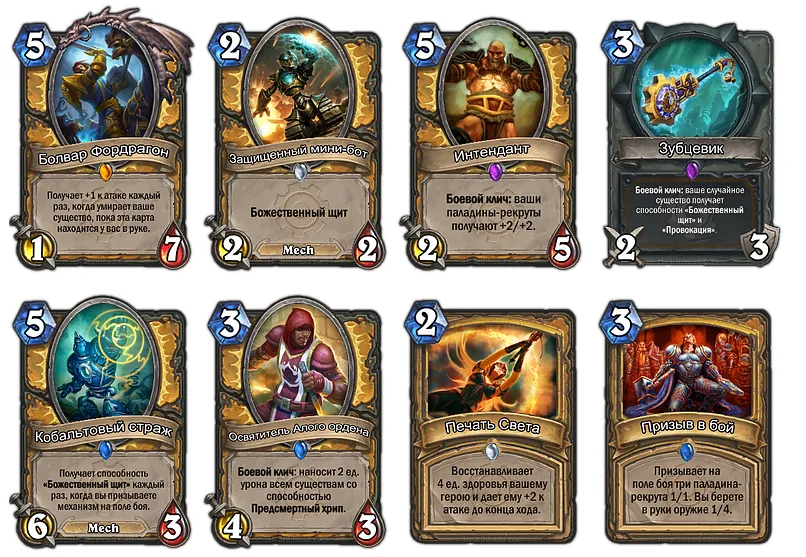 Защищенный мини-бот, наоборот, используется в агрессивной колоде и колодах на основе божественных щитов. Печать света простенькая, но зато она сама по себе и не нуждается в хитрых комбинациях.