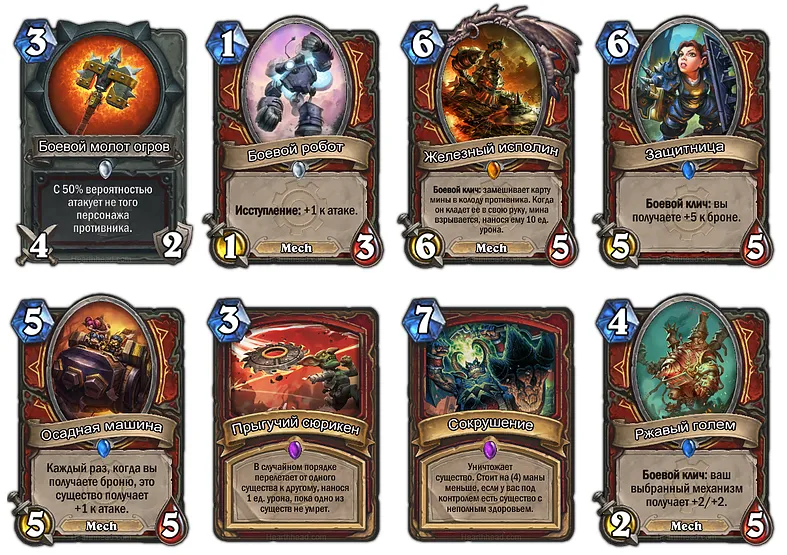 Боевой молот огров заменит вам Секиру, если вы и так бьете кого попало. Боевой робот выглядит вполне заманчиво для первого хода, но никогда не влезает в колоду.
