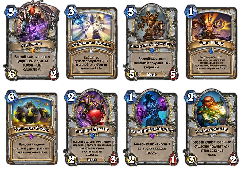 Световая бомба особенно хороша против любителей крупных животных. Теневой бомбардир в теории может спасти вам партию на последних ходах, когда у разбойника или чернокнижника остаются буквально последние единицы здоровья, но реально используется. Зато из синих карт одна краше больше, чем кажется: Теневой боксер сочетается с Пиромантами и Кругами и хорошо работает против ранней агрессии.