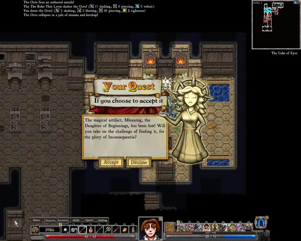 Кстати об истории. Её в игре нет. Есть только цель — добраться до лича Дредмора и победить его. Никаких NPC и диалогов. Даже побочные квесты вы получаете от богини Непоследовательности, помолившись её статуе. Разумеется все её задания типовые, но это в лучшей степени соответствует атмосфере игры.