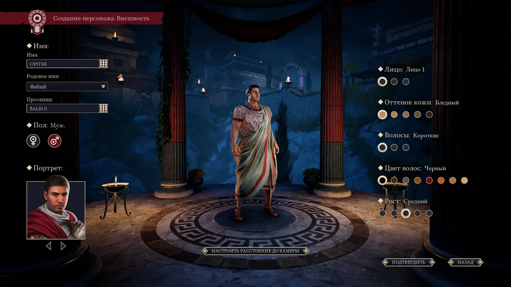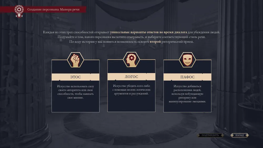 При создании можно выбрать пол, портрет, внешность и один из навыков ораторского искусства: логос, пафос или этос. Второй можно будет бесплатно изучить позднее (об этом даже сообщают при создании персонажа).