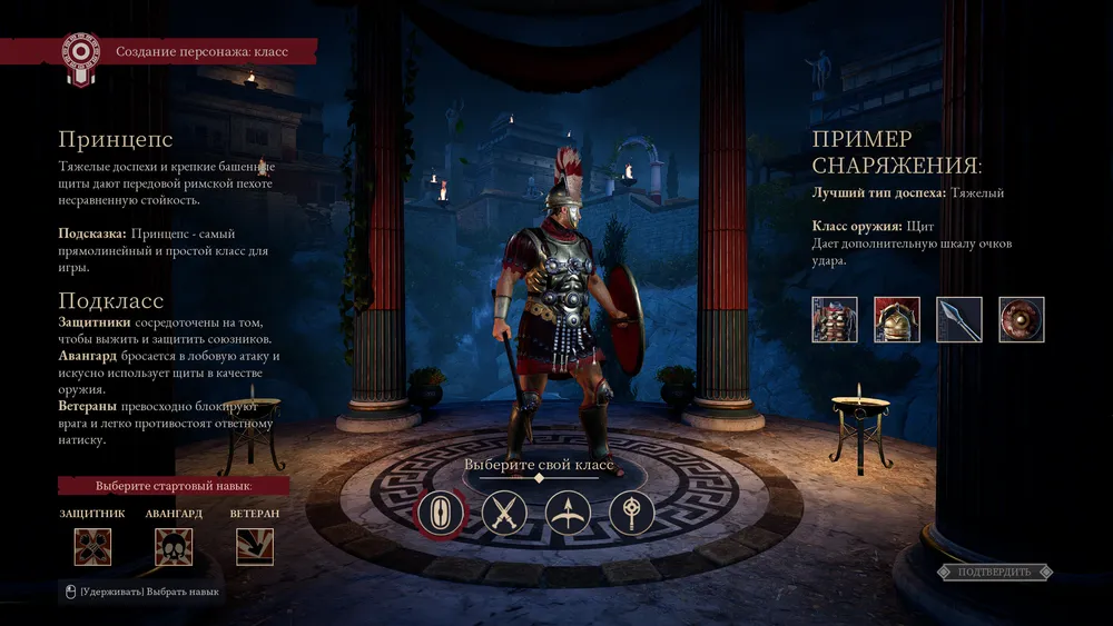 Чуть позже станет доступен выбор класса. Всего в игре их четыре: принцип («танк»), велит («вор»), триарий («сапорт») и саггитарий («лучник»).
