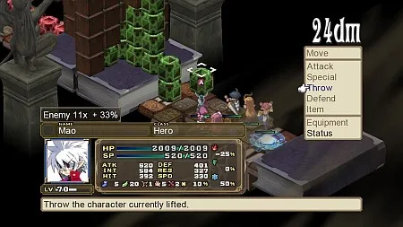 Кстати, про швыряние. В Disgaea персонажи всегда отличались тем, что могли хватать, что ни поподя (врагов, друзей, ящики, бочки) и бросать их. Причем, умели залазить друг другу на плечи, что позволяло с первого хода докинуть счастливчика хоть до самого конца уровня. Правда, дальше этого функционал не распространялся (хотя сейчас в Class World эта способность более чем востребована). В Nippion Ichi решили исправить досадную оплошность — и появилась отдельная ветка боевых навыков, связанных с живыми башнями!