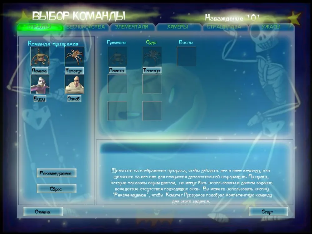 Для ленивых предусмотрена кнопочка, которая подберёт наилучшую и компетентную по мнению Комитета Призраков команду. Казалось бы, что в Ghost Master нужно только пугать смертных, но нет, это не так. Через несколько заданий вы это поймёте. Далее будут миссии и по другим направлениям, таким как, например, помощь смертным в вызове Теневика. Есть и задание, где надо показать трупы, спрятанные в доме, людям, чтобы началось полицейское расследование. Начиная с середины игры, для каждого задания выбирать команду призраков придётся отдельно.