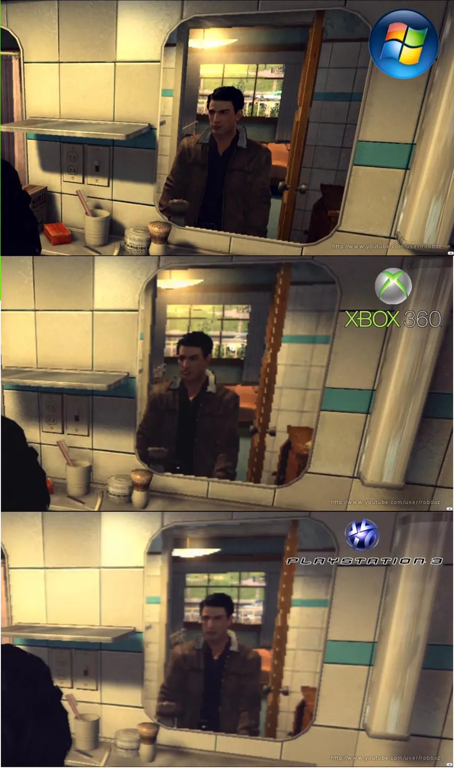 Мне стало интересно и я запустил другие версии демо Mafia 2 на своих консолях. Если честно, то я был "приятно" удивлен, когда увидел, что там творится. Первым делом я запустил версию для Xbox 360, так как демо на ней появилось раньше, чем на консоле Sony. Сначала все было довольно-таки неплохо, я прошелся главным героем по комнате, ответил на звонок босса, а дальше повернулся к окну и просто ужаснулся. В окне творилось что-то неладное: жуткие "лесенки" по всем объектам и людям. От такой картины я просто отвернулся от отвращения и пошел умыться в виртуальной ванной, чтобы немного расслабиться и привести себя в чувства. Но там меня ждало еще большее разочарование.