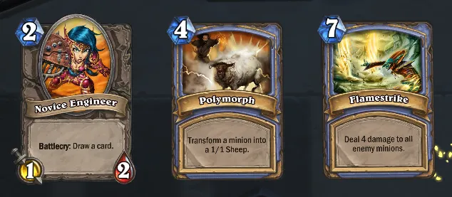 - Заклинания - уникальные для каждого класса карты, отличающиеся разнообразием эффектов. Например, маги способны превращать вражеских миньонов в овец и наносить прямой урон, жрецы лечат и тащат карты из колоды противника (это так в игре представлен контроль над разумом), а чернокнижники расплачиваются за всякие бонусы своими очками жизни.