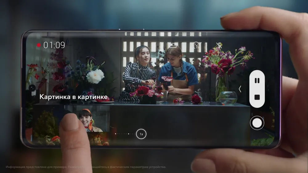Оба изображения сразу пишутся в один файл. Причём можно также на лету менять и режим — с двух изображений рядом на «картинку в картинке». Во втором случае положение и размер «внутренней картинки» также можно менять по ходу съёмки так, как вам удобнее.